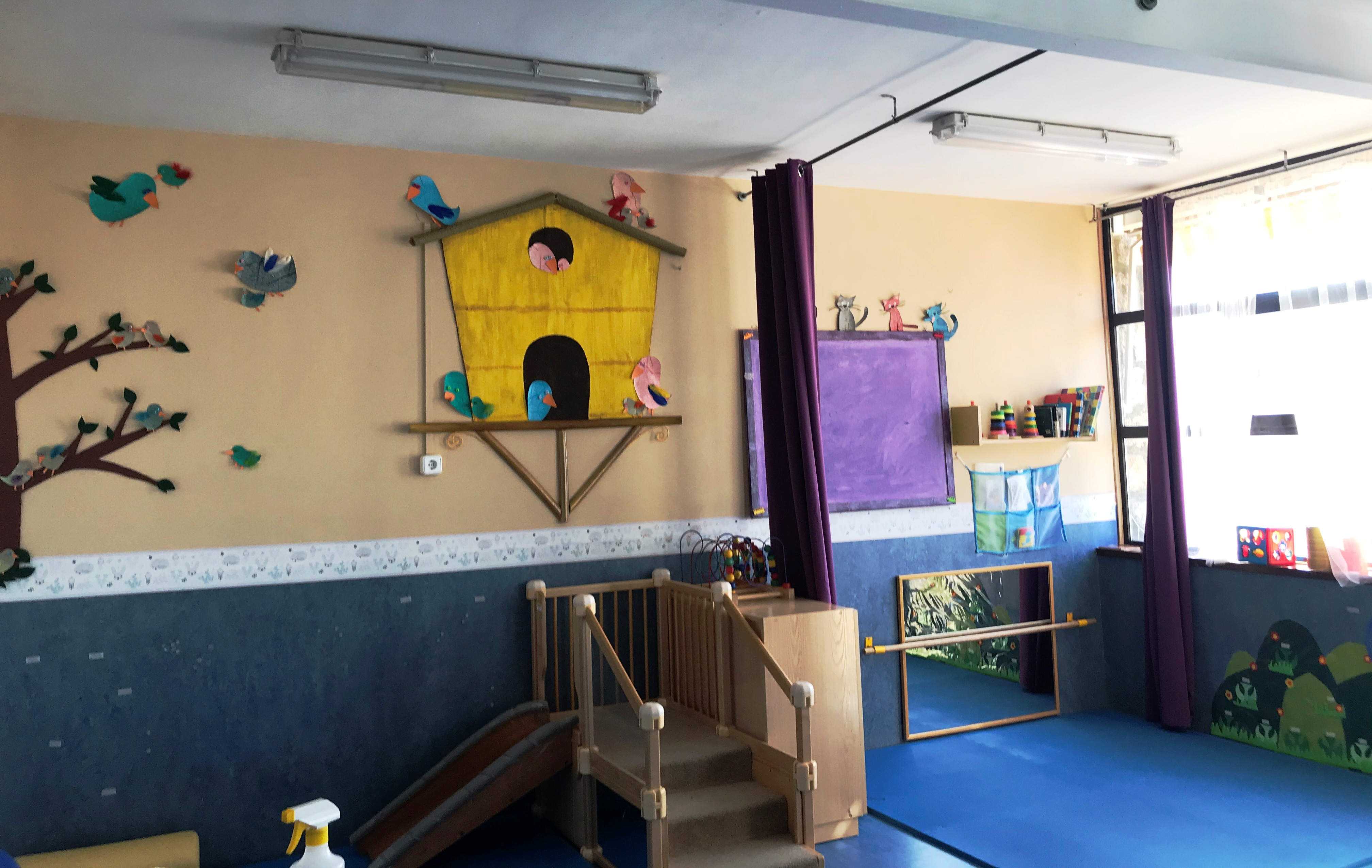 El centro cuenta con dos aulas con baño incorporado, un patio, una zona de biblioteca, un despacho, una cocina, un almacén y un aseo de adultos.