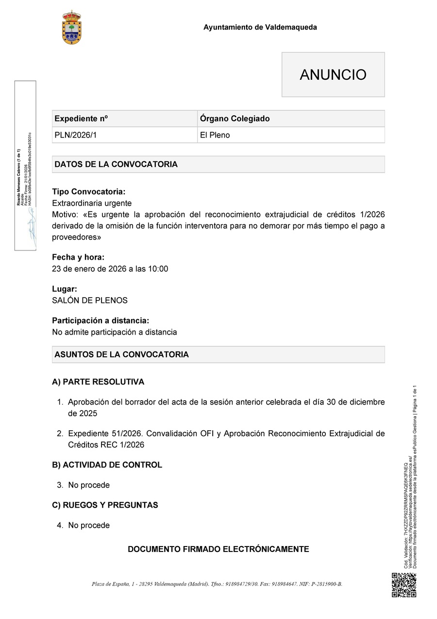 Convocatoria a Pleno sesión extraordinaria urgente, viernes 23 de enero